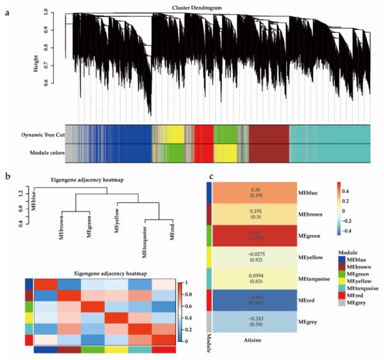 Weighted gene correlation network analysis (WGCNA) is a new network modeling method designed for studying biological networks based on pairwise correlations between variables [,]. This method allows researchers to find the co-expressed gene modules, and explore the relationship between gene networks and phenotypes of interest, and the hub genes in the networks. We used WGCNA analysis to explore candidate genes involved in atisine biosynthesis. A total of 11,661 genes (FPKM > 10 in three biological replicates) in the root were used to perform the co-expression analysis. The MAD (median absolute deviation) of each gene was calculated using the gene expression profile and the top 4000 genes were selected to analyze. WGCNA was further used to build the scale-free co-expression network, and six co-expression modules were finally obtained, each module contained 270~1107 genes. The modules were color-coded, as shown in Figure 5a. The comparison of modules genes (Figure 5b) revealed four related module groups, which displayed similar expression profiles in different samples: (i) MEblue; (ii) MEbrown, MEgreen; (iii) Meyellow; (iv) MEturquoise, MEred (Supplementary Table S4).