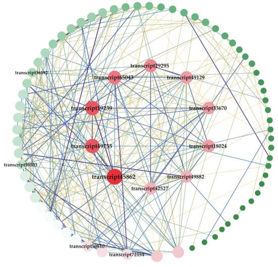 Co-expression analysis in module green of A. gymnandrum. Transcript 45862, transcript 49735, transcript 49882, transcript 19239, transcript 65043, transcript 42527, transcript 29295, transcript 33670, and transcript 49129 were filtered as hub genes by degree. The circle depicts genes co-expressed with 10 hub genes (r > 0.8; 77 genes in total). The size and color (red to green) of the circle were arranged according to the degree, and the lines indicate the p-value between the genes (purple is the largest and yellow is the smallest).