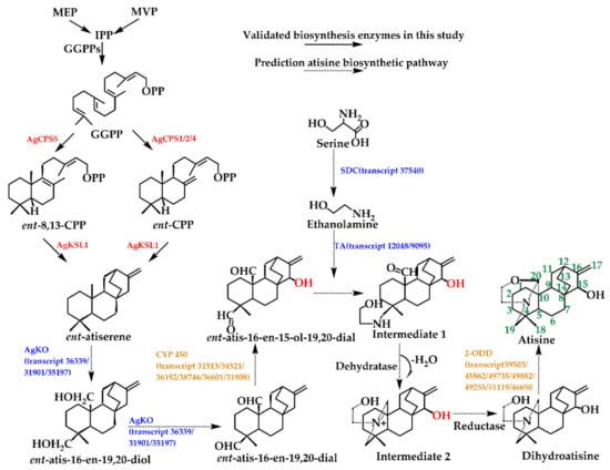 DAs are the main pharmacologically active and toxic compounds in Aconitum, with more than 1500 compounds identified [,,]. DAs are classified into four skeletal types: C18, C19, C20, and bis-diterpenoid alkaloids. The complexed C18-DAs and C19-DAs were proposed to be produced by the rearrangement of C20-DAs [,,]. Therefore, an analysis of the biosynthetic pathway of C20-DAs is the basis for studying the structural modification of complex DAs. Like other diterpenoids, DAs were thought to be produced from the diterpene precursor geranylgeranyl pyrophosphate (GGPP), which is synthesized through IPP and DMAPP produced from the mevalonate (MVA) pathway in the cytoplasm and the methylerythritol 4-phosphate (MEP) pathway in the plastid. Copalyl diphosphate synthase (CPS) and kaurene synthase-like (KSL) enzymes then serially catalyze GGPP to form ent-copalyl diphosphate (ent-CPP) and ent-atiserene or ent-kaurene, which establishes the skeleton structure of atisine and napelline type C20-DAs in A. carmichaelii []. Atisine-type alkaloids are considered to be the simplest group of C20-DAs []. Atisine was found to be widely distributed in Aconitum species [,], and it was also the hotspot component for the total synthesis of C20-DAs [,].