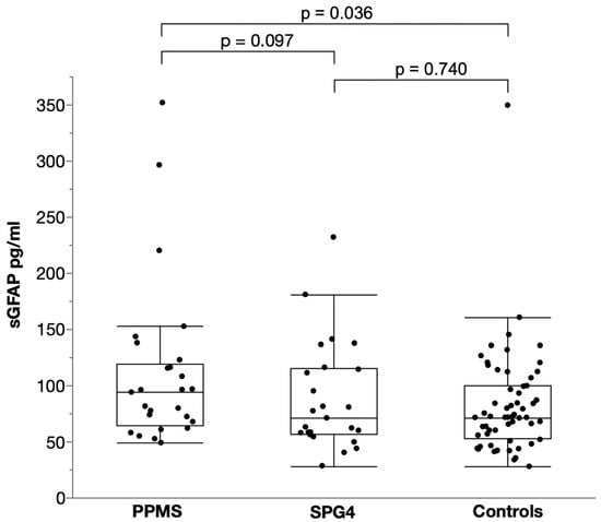 For sGFAP, there was trend towards higher levels in PPMS (median 93.9 pg/mL, IQR 64.7–119.4) than in SPG4 (median 70.9 pg/mL, IQR 56.9–115.1) controlling for age and sex, but this difference did not reach significance (two-way ANCOVA, p = 0.097, F (1, 46) = 6.851, B = 0.085, partial η² = 0.059; Figure 2); levels in PPMS were estimated to be 22% higher than in SPG4. Compared to controls (median 71.5 pg/mL, IQR 52.7–99.6), sGFAP levels were significantly elevated in PPMS (two-way ANCOVA, p = 0.036, F (1, 81) = 4.531, B = 0.096, partial η² = 0.053) controlling for age and sex, resulting in a 25% increase. They did not differ between SPG4 and controls (two-way ANCOVA, p = 0.74, F (1, 81) = 3.832, B = 0.015, partial η² = 0.001).