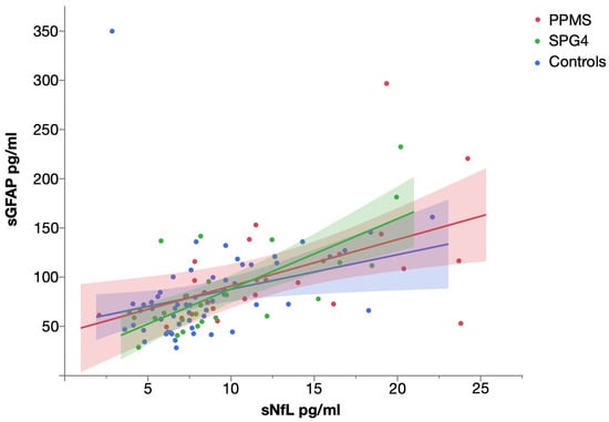 Levels of sNfL and sGFAP were significantly correlated in PPMS (Spearman’s ρ = 0.563, p = 0.003), SPG4 (Spearman’s ρ = 0.630, p = 0.001) and controls (Spearman’s ρ = 0.527, p < 0.001) (Figure 3).