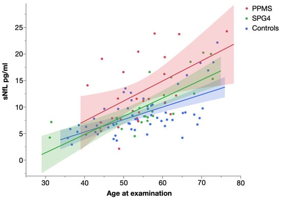 Levels of sNfL significantly increased with age in all three groups (Figure 4). The strongest influence was found in SPG4 (Spearman’s ρ = 0.872, p < 0.001), followed by controls (Spearman’s ρ = 0.585, p < 0.001) and patients with PPMS (Spearman’s ρ = 0.439, p = 0.028).