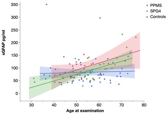 Scatter plot of serum GFAP levels in PPMS, SPG4 and controls by age, with linear fit. Shaded areas represent 95% confidence intervals.
