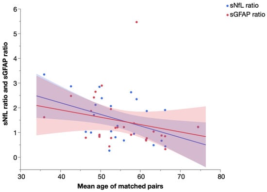 To further assess the temporal dynamics of sNfL and sGFAP, we performed a pair-matching procedure of SPG4 and PPMS patients as detailed in the Section 4.4 and calculated the ratio (biomarker levelPPMS patient: biomarker levelSPG4 patient, e.g., 20 pg/mL: 10 pg/mL = 2) of sNfL and sGFAP levels for each matched pair. We then analyzed the correlation of the sNfL and sGFAP ratio and the mean age of matched pairs (Figure 6). While we found a significant increase in sNfL levels in PPMS compared to SPG4 (see above), the sNfL ratio of PPMS and SPG4 patients significantly declined in older subjects (Spearman’s ρ = −0.410, p = 0.042). The same trend was observed for sGFAP, but without reaching significance (Spearman’s ρ = −0.370, p = 0.069).