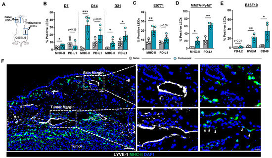 Peritumoral LECs upregulate MHC-II, PD-L1, and various co-inhibitory molecules compared to naïve dermal LECs. (A) Schematic of experimental design analyzing naïve dermal LECs in the ear and peritumoral LECs of the same mice. (B) Quantification of MHC-II and PD-L1 positivity in naïve and peritumoral LECs (CD45- podoplanin+ CD31+) at day 7, 14, and 21 post B16F10 tumor inoculation in WT (C57/BL6) mice. (C) Quantification of MHC-II and PD-L1 positivity in naïve and peritumoral LECs at day 14 post E0771 tumor inoculation in WT mice. (D) Quantification of MHC-II and PD-L1 positivity in naïve and peritumoral LECs in MMTV-PyMT mice with spontaneous mammary tumors. (E) Quantification of PD-L2, HVEM, and CD48 positivity in naïve and peritumoral LECs at day 21 post B16F10 tumor inoculation in WT mice. (F) Representative immunofluorescence image stained for LYVE-1 (white) and MHC-II (green) in peritumoral and skin margin lymphatics in WT mice at day 14 post B16F10 inoculation. DAPI nuclear staining in blue. Scale bars, 100 μm (left), 20μm (top right and bottom right). Statistical significance assessed using paired student’s t test on data from at least 3 biological replicates; error represented as SD. *, p < 0.05; **, p < 0.01; ***, p < 0.001.