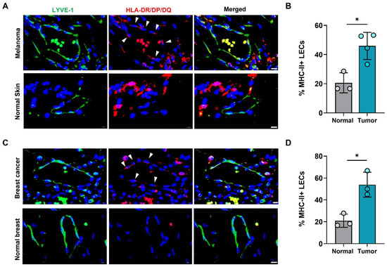 Human peritumoral LECs upregulate MHC-II in melanoma and breast cancer. (A) Representative immunofluorescence image and (B) quantification of LYVE-1 (green) and HLA-DR/DP/DQ (red) staining in human tissue microarray of melanoma and normal skin tissues. (C) Representative immunofluorescence image and (D) quantification of LYVE-1 (green) and HLA-DR/DP/DQ (red) staining in human tissue microarray of breast cancer and normal breast tissues. DAPI nuclear staining in blue. Scale bars, 10μm. Statistical significance assessed using paired student’s t test on data from at least 3 biological replicates; error represented as SD. *, p < 0.05.