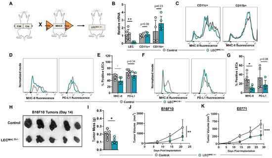 We next sought to determine the biological significance of increased LEC MHC-II expression in the TME. To answer this question, we generated a conditional lymphatic-specific MHC-II−/− mouse by crossing Flt4CreERT2 mice with H2-Ab1-floxed mice, henceforward referred to as LECMHC-II−/− (Figure 4A). Treatment with tamoxifen in LECMHC-II−/− mice induced deletion of MHC-II mRNA in FACS-sorted LN LECs but not in LN CD11c+ or CD11b+ immune cells (Figure 4B,C). We confirmed these findings in LN LECs with flow cytometry and additionally showed that PD-L1 expression is not modulated by tamoxifen treatment in LECMHC-II−/− mice (Figure 4D,E). Peritumoral LEC MHC-II expression was also significantly decreased in these animals by a mean of 64.5% compared to WT controls; however, PD-L1 expression was again unchanged (Figure 4F,G). Since Flt4 can also be expressed on blood endothelial cells (BECs) and macrophages, we analyzed MHC-II expression in LN BECs and tumor-associated macrophages (TAMs) in LECMHC-II−/− mice compared to controls and found no significant difference (Figure S4).