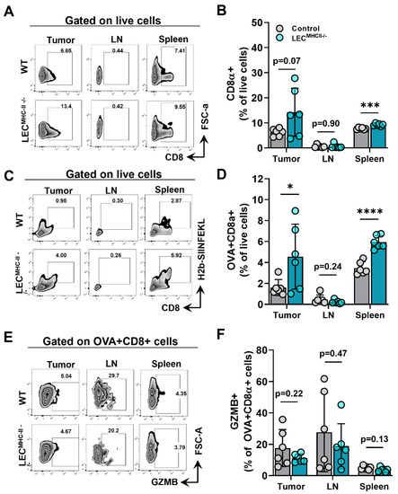 Given that lymphatic structure, drainage, peritumoral lymphatic density, and baseline immune cells were unchanged in the setting of LEC-specific MHC-II deletion, we hypothesized that increased peritumoral LEC MHC-II expression tolerized the host adaptive immune response to tumor antigens in a manner that is similar to the physiologic role of LECs in maintaining peripheral tolerance. We reasoned that disruption in LEC MHC-II dependent antigen presentation would alleviate immunosuppressive pressures in the TME, thus allowing for better tumor control by the adaptive immune response. To test our hypothesis, LECMHC-II−/− mice and controls were implanted with B16F10 coupled to foreign peptide OVA (B16F10-OVA), and leukocytes were quantified in various locations, including the primary tumor (TILs), the tumor-draining lymph node, and the spleen. Overall, CD8+ T cells were not different between LECMHC-II−/− and controls in the primary tumors or tumor-draining LNs but were higher in spleens of LECMHC-II−/− mice (Figure 5A,B). However, we found a significantly greater number of tumor specific OVA+ CD8+ T cells in the primary tumors and spleens of LECMHC-II−/− mice compared to controls (Figure 5C,D). There were no differences in the number of OVA+ CD8+ T cells in the tumor-draining LNs (Figure 5C,D). We found no differences in intracellular granzyme expression in OVA+ CD8+ cells between tumor-bearing LECMHC-II−/− mice and controls in any location (Figure 5E,F).