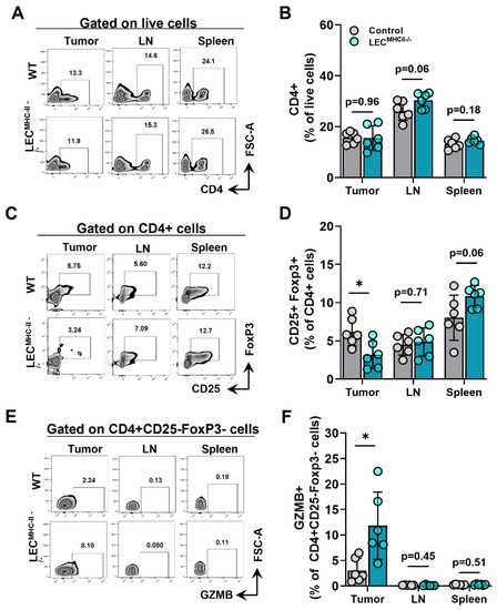 Because MHC-II primarily interacts with the TCR of CD4+ T cells, we hypothesized its deletion would also affect CD4+ phenotypes. The number of CD4+ T cells in the primary tumors, tumor-draining LNs, and spleens of tumor-bearing LECMHC-II−/− mice were not different from controls (Figure 6A,B). However, the number of Tregs (CD4+ CD25+ FoxP3+) were significantly lower in the tumors of LECMHC-II−/− mice but not different in tumor-draining LNs or spleens (Figure 6C,D). Interestingly, non-regulatory CD4+ T cells (CD4+ CD25- FoxP3-) also had a greater proportion of granzyme B+ cells in the TME of LECMHC-II−/− mice compared to controls (Figure 6E,F). These data show that attenuated tumor growth in LEC-specific MHC-II knockout is associated with increased numbers of tumor-specific CD8+ and effector CD4+ T cells, as well as decreased numbers of T regulatory CD4+ cells in the TME. Representative histologic sections corroborate decreased number of CD4+FoxP3+ double staining cells found in the peritumoral region of LECMHC-II−/− compared to controls; these sections also show grossly higher density of granzyme B staining CD8+ cells in the peritumoral region of LECMHC-II−/−mice compared to controls even though this result did not reach statistical significance using flow cytometric analysis (Figure S7).