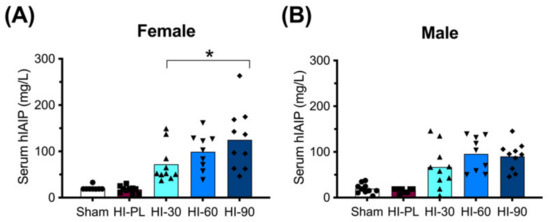 Brain weights were significantly (p < 0.05) higher in the female sham-treated group compared with the HI-PL- (0.83-fold), HI 30 (0.91-fold), HI 60 (0.89-fold) and HI 90 (0.89-fold) mg/kg hIAIP-treated groups. There were no significant differences in brain weight between the HI-PL- and the HI 30, HI 60, or HI 90 mg/kg hIAIP-treated groups (Figure 2C). Therefore, treatment with hIAIPs (30, 60, or 90 mg/kg) did not significantly attenuate the reductions in female brain weight after exposure of neonatal rats to severe HI. Brain weights were not significantly different between male sham and HI-PL groups (Figure 2D).