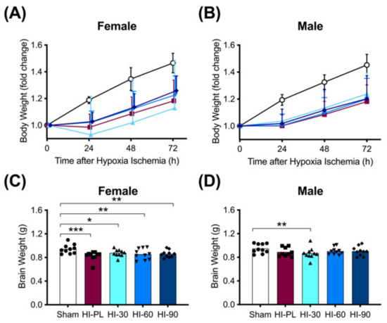 The changes in body weights of the pups at 24, 48 or 72 h after exposure to HI are shown in Figure 2A,B. The sham group was significantly (p < 0.05) heavier than the HI-PL-, HI 30, HI 60, and HI 90 mg/kg hIAIP-treated groups at 24, 48 and 72 h after exposure to HI (Figure 2A,B). Groups exposed to HI did not gain weight from 0 to 24 h, before returning to a trajectory in daily weight gain that was similar to the sham groups from 24 to 72 h (Figure 2A,B). Body weights did not differ significantly between the groups treated with 30, 60, or 90 mg/kg hIAIPs at any time-point for the females or males (Figure 2A,B). Therefore, treatment with hIAIPs (30–90 mg/kg) did not significantly attenuate the reductions in body weight gain over the first 24 h after exposure to severe HI.