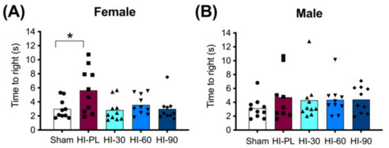 The time taken to complete a righting reflex task is shown in Figure 3. The female HI-PL group took significantly longer to complete the reflex task than the sham group (Figure 3A, 1.9-fold, p < 0.05). The HI 30 (0.9-fold), HI 60 (1.2-fold) and HI 90 (1.0-fold) mg/kg hIAIP-treated groups did not have significantly different times to complete the reflex compared to the sham group (Figure 3A). Therefore, treatment of female rats with hIAIPs (30, 60, and 90 mg/kg) after neonatal exposure to HI attenuated righting reflex speed to times that did not differ significantly from the sham group. The time to complete the reflex was not significantly different between male sham and HI-PL groups (Figure 3B). Therefore, the test could not distinguish differences between the HI-PL- and HI-hIAIP-treated groups of male neonatal rats.