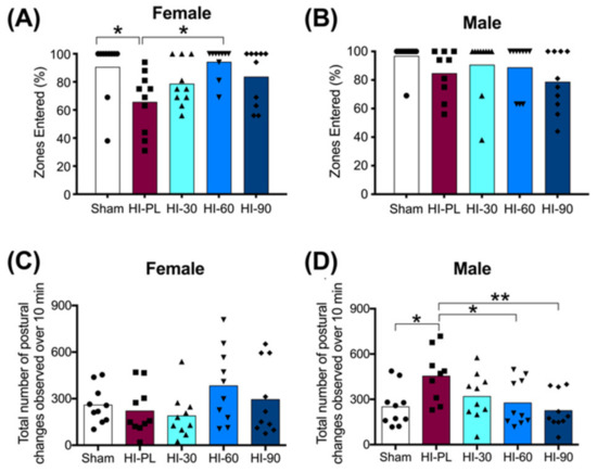 The percentage of zones entered during exploration of the open-field is shown in Figure 4A,B for the females and males, respectively. The majority of pups in the sham group entered all zones (8/10 females; 9/10 males), with an average of 94% of zones entered in the male and female sham groups (Figure 4A,B). The HI-PL group of females explored significantly fewer zones than the sham group (Figure 4A, 0.7-fold, p < 0.05). There were no significant differences in the percentage of zones entered between the sham group of females and the HI 30, HI 60, or HI 90 mg/kg hIAIP-treated groups (Figure 4A). The female HI 60 mg/kg hIAIP-treated group entered significantly more zones than the HI-PL group (Figure 4A). Therefore, treatment with hIAIPs (30, 60, 90 mg/kg) after exposure of the female neonatal rats to HI attenuated zone exploration to levels that did not differ significantly from the sham group. The percentage of zones entered was not significantly different between male sham and HI-PL groups (Figure 4B); therefore, this task could not distinguish differences between the HI-PL- and HI-hIAIP-treated groups of male neonatal rats.