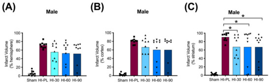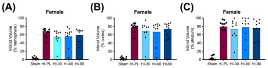The average whole hemisphere infarct volumes in the HI-PL group were 71% in the males and 65% in the females, the average cortical infarct volumes were 80% in the males and 77% in the females and the average striatal infarct volumes were 91% in the males and 79% in the females (Figure 5 and Figure 6). These quantities of infarct volumes suggest a severe degree of brain injury for the Rice–Vannucci model. Representative images of infarct volumes in the placebo-treated males and females are shown in Figure 7. There were no significant differences in the extent of the infarct volumes in the HI-PL group compared with the HI 30, HI 60, or HI 90 mg/kg hIAIP-treated groups in the whole hemisphere or cortex in the males (Figure 5A,B), or any of the brain regions in the female neonatal rats (Figure 6). There were significantly lower infarct volumes in the striatum of the HI 30 (0.74-fold, p < 0.05), HI 60 (0.74-fold, p < 0.05) and HI 90 (0.74-fold, p < 0.05) mg/kg hIAIP-treated groups compared with the HI-PL-treated group of males (Figure 5C). Significant differences were not observed between the infarct volumes of HI 30, HI 60, or HI 90 mg/kg hIAIP-treated groups for either sex in any brain region. Therefore, all animals in the HI 30, HI 60, and HI 90 mg/kg hIAIP-treated groups were combined into one hIAIP group per sex for subsequent analysis (Figure 8 and Figure 9). The combined HI-hIAIP (30, 60, 90 mg/kg) group of males exhibited significantly lower infarct volumes than the HI-PL group in the hemisphere (0.75-fold, p < 0.05), cortex (0.77-fold, p < 0.05) and striatum (0.74-fold, p < 0.05; Figure 8B). Significant differences were not observed in the females (Figure 8A).