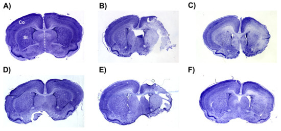 Representative images of infarct volumes in the neonatal rat brain 72 h after exposure to hypoxia–ischemia (HI). Coronal cross-sections of the brain stained with cresyl violet for female sham placebo (A), female HI placebo (B), female HI 30 mg/kg IAIP-treated (C), male sham placebo (D), male HI placebo (E), male HI 30 mg/kg IAIP-treated (F) groups. The area for cerebral cortex (Co) and striatum (St) measurements is highlighted in (A). Hemisphere measurements were taken to the left or right of the midline (white dotted line), as highlighted in (A). Figure 5 and Figure 6 show the quantification of infarct volumes for all animals of each treatment group.