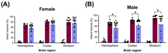 Every seventh cryosection per 2 mm brain segment was selected for histological quantification. The number seven was randomly decided. The slides were removed from the −80 °C freezer and air-dried overnight. Slides were then exposed to 1:1 chloroform and absolute ethanol (20 min). Sections were each stained with cresyl violet (0.1% w/v, 6 min; MilliporeSigma, St. Louis, MO, USA), then rinsed with dH2O (1 min). The sections were then subjected to 4 min washes of 95% ethanol, 100% ethanol, and 95% ethanol. The slides were then air-dried overnight and mounted (Cytoseal XYL, Richard-Allan Scientific, Canton, MI, USA). Images of each section were obtained using a Micropublisher 6 CCD Camera (QImaging, Surrey, BC, Canada). Stained tissue volume was measured with ImageJ by two independent observers that were not aware of the group assignments. Total stained tissue, stained cortex, and stained striatum were quantified for the left and right hemispheres of each brain section (Figure 7). Stained tissue volumes were calculated using the known 2 mm distances between each section. Total infarct volume was examined using the following formula: infarct (%) = [1 − (ipsilateral volume/contralateral volume)] ×100 [18,51]. Negative values were adjusted to 0 to signify no infarct.