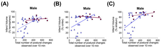 Significant correlations were not observed between terminal hIAIP concentrations (Figure 1) and either infarct volumes in any brain region or performance in the behavioral tests (data not shown). Spearman correlation analysis identified significant correlations between the total number of demonstrations of contracted or extended postures during open-field exploration and infarct volumes of the whole hemisphere (R = 0.46, n = 30, p < 0.05), cortex (R = 0.38, n = 30, p < 0.05) and striatum (R = 0.48, n = 30, p < 0.01) brain regions (Figure 9) in the males exposed to severe HI and treated with hIAIPs (30, 60, 90 mg/kg). The correlations were not significant between brain infarct volumes and performance in the righting reflex or open-field exploration tasks in the HI-hIAIP treated females (data not shown). Therefore, treatment with hIAIPs after exposure of neonatal females to HI may result in preservation of behavioral capacities through mechanisms not directly related to the protection of gross brain volume.
