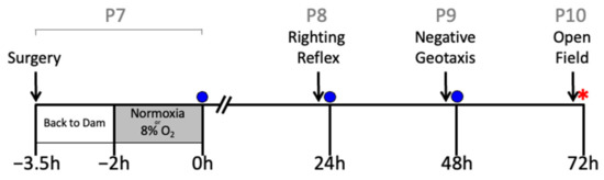 Study design. Postnatal day 7 (P7) pups were exposed to either sham surgery or right carotid artery ligation. Then, they were returned to the dam for recovery from surgery for 90 min. Thereafter, they were exposed to either HI (8% O2, right carotid artery ligation groups) or normoxia (room air, sham group) for 2 h. Righting reflex (P8), negative geotaxis (P9) and small open-field (P10) analyses were performed 23, 37 and 71 h after HI, respectively. Intraperitoneal injections of human plasma-derived inter-alpha inhibitor proteins (hIAIPs, 30, 60, or 90 mg/kg) or the placebo (PBS) were injected immediately after hypoxia/normoxia (zero h) and repeated 24 and 48 h after hypoxia/normoxia. Injections (blue circles) were given after the behavioral tests had been completed. Following the conclusion of the small open-field analysis, animals were anesthetized, their blood was collected, and brains weighed and preserved for histological analysis (red star).
