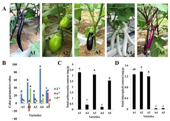 Phenotypes of the five eggplant varieties with different fruit colors. (A) Morphologies of the fruits of the five eggplant varieties; (B) Color parameters of fruit peels of the five eggplant varieties; (C) Total anthocyanin contents of the five eggplant varieties; (D) Total chlorophyll contents of the five eggplant varieties. The different letters on top of each bar indicate significant differences among the five eggplant varieties at p < 0.05.