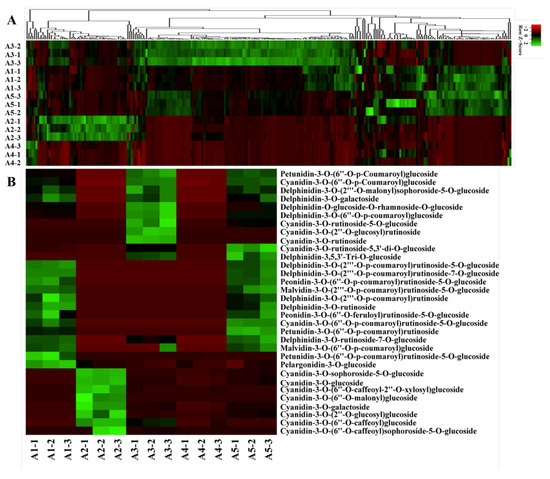 Metabolome analyses of different-colored eggplant fruits. (A) Hierarchical clustering of flavonoid metabolites in the five eggplant varieties; (B) The anthocyanins detected in the five eggplant varieties.