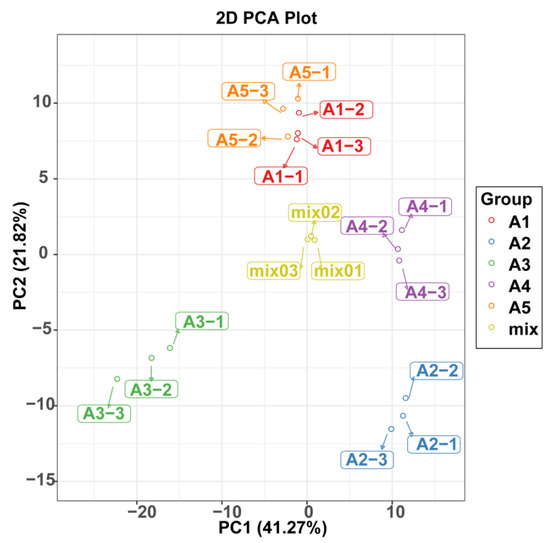 A principal component analysis was also used to illustrate the internal structures of multiple variables in the five varieties (Figure 3). In the PCA plot, the quality control (QC) samples were grouped together, indicating the stability and repeatability of our analysis. Consistent with the HCA results, A1 and A5 showed the closet distance in the plot, indicating similarities in their metabolic accumulation pattern. Although A1 and A5 gathered near each other, the five varieties could be distinguished easily.
