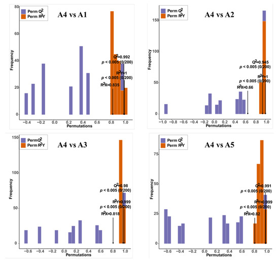 Orthogonal partial least-squares discriminant analysis (OPLS-DA) model of comparison groups, including A4 vs. A1, A4 vs. A2, A4 vs. A3, and A4 vs. A5.