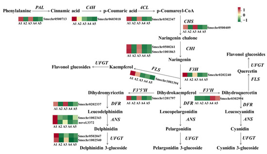 The structural genes involved in the flavonoid biosynthesis pathway were also differently expressed among the comparison groups of A1 vs. A3, A1 vs. A5, and A3 vs. A5. In the comparisons of A1 vs. A5 and A3 vs. A5, both early and late biosynthesis genes were downregulated in A5, including PAL, 4CL, C4H, CHS, CHI, F3H, F3 3HH, DFR, ANS, and UFGT. Notably, in the A1 vs. A3 comparison, the early biosynthesis genes, including CHS, CHI, F3H, and F3nd H, were not differently expressed, and most of the DEGs were late biosynthesis genes, such as DFR, ANS, and anthocyanin-modified genes (Smechr0502047, Smechr0400421, and Smechr1102789).