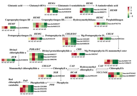 The green color of eggplant fruit peels is mainly affected by chlorophylls. In this study, a total of 27 DEGs related to chlorophyll metabolism were identified (Figure 7). Compared to A2 with green fruit peels, most of the DEGs showed lower expression in A4 and A5, including HEMA (Smechr0402030 and Smechr0100518), HEMC (Smechr0702754), HEME (Smechr0400257 and Smechr0601135), HEMF (Smechr0400064), HEMG (Smechr0102139), CHLH (Smechr0400430), CHLM (Smechr0303264), CRD (Smechr1002947), POR (Smechr0702049), DVR (Smechr0100030), CAO (Smechr0601739 and Smechr1200635), NOL (Smechr0701042), and HCAR (Smechr0902459).