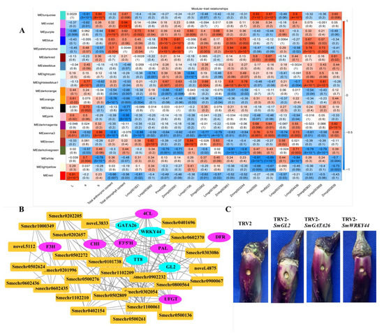 Gene network and key candidate genes involved in anthocyanin biosynthesis, identified by WGCNA. (A) Module–trait associations based on Pearson correlations; (B) Gene network of the hub genes in the purple module, which were positively correlated with the total anthocyanin content (r2 = 0.84, p = 1× 10−4); (C) The effect of SmGL2, SmGATA26, and SmWRKY44 silencing in VIGS eggplant fruits.