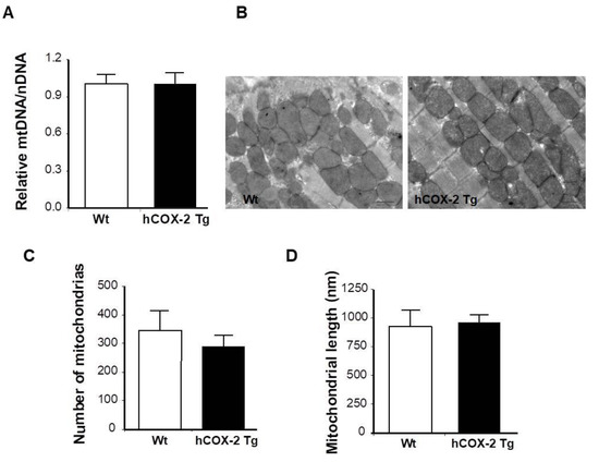 Since the observed increase in mitochondrial proteins might reflect an increase in total cellular mitochondrial quantity, we determined mitochondrial biogenesis by measuring mitochondrial DNA content. As shown in Figure 1A, mitochondrial DNA was not affected by COX-2 expression. Mitochondrial biogenesis was also assessed by electron microscopy. No ultrastructural differences were observed in cardiac samples between hCOX-2-Tg and Wt mice (Figure 1B). Furthermore, quantitative analysis revealed that cardiomyocyte-specific COX-2 expression did not modify either the density or the size of mitochondria in the hearts of hCOX-2-Tg mice (Figure 1C,D).