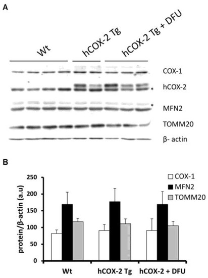 Mitochondrial and cytosolic protein expression in hCOX-2 Tg mice. Total extracts were prepared from Wt and hCOX-2 Tg mice hearts, and proteins (30 μg/lane) were analyzed by Western blot. (A) Representative image showing the expression of COX-1, human COX-2, and proteins located at cytosol (β-actin) or mitochondria (MFN2 and TOMM20). * nonspecific bands. (B) For densitometric analysis, the bands were scanned and band densities were quantified using Image J 1.50a software. Relative band intensity of COX-1, MFN2, and TOMM20 normalized to that β-actin are presented as means ± SD of 2 independent immunoblots.