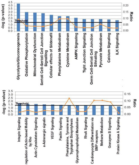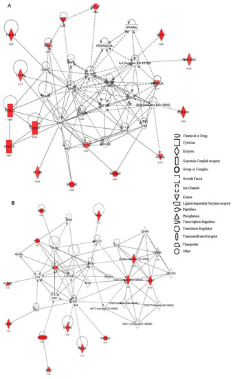 To gain insight into the biological significance of quantitative proteomic results, we performed an enrichment analysis using the Ingenuity Pathway Analysis (IPA) software. The highest ranked canonical pathways that were affected were glycolysis/gluconeogenesis, oxidative phosphorylation, and mitochondrial dysfunction (Figure 3). The IPA analysis also identified two protein networks that were statistically significant (p < 0.05). Network 1 obtained the highest significant score (32; Figure 4A). The main function of this network was associated with carbohydrate metabolism, cardiovascular disease, or tissue morphology, whereas Network 2, with a significant score of 25, was associated with cell morphology, cell function and maintenance, and cell death (Figure 4B).