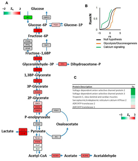 Systems biology analysis of quantified proteins in hCOX-2 Tg mice. (A) Representative image of the enzymes involved in glycolysis and gluconeogenesis. All enzymes quantified in this pathway were downregulated (red color), except for HK1, which was increased (green color). Gray color indicates enzymes that were not quantified. (B) Cumulative distributions of the standardized variable at the protein level (i.e., corrected log2 ratios of proteins expressed in units of standard deviations), for proteins belonging to glycolysis/gluconeogenesis and calcium signaling. The black sigmoid is the theoretical null hypothesis distribution; a displacement toward the left indicates an increase in protein concentration in hCOX2 Tg mice. (C) Calcium signaling proteins quantified in hCOX-2 Tg mice.