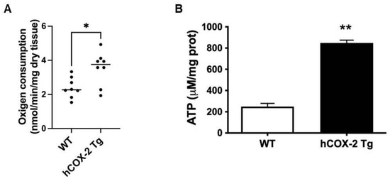 Oxygen consumption and ATP levels are elevated in hCOX-2 Tg mice. (A) Oxygen consumption of permeabilized fibers from Wt and hCOX-2 Tg mice was measured as described in Material and Methods. Results are means ± SD; n = 3; * p < 0.05 between animal models. (B) ATP levels were determined in a pool of tissue homogenates (n = 4) from Wt and hCOX-2 Tg mice. ** p < 0.01.