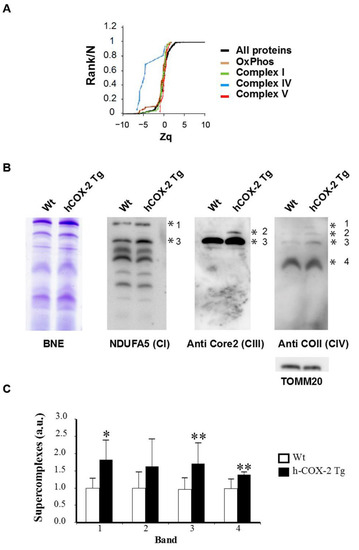Analysis of mitochondrial supercomplex components. (A) Cumulative distributions of the standardized variable at the protein level (i.e., corrected log2 ratios of proteins expressed in standard deviation units), for all OxPhos proteins or those belonging to Complex I, III, IV and V. The black sigmoid is the theoretical null hypothesis distribution; a shift to the left indicates an increase in protein abundance in hCOX2 Tg mice. (B) Representative image of the detection of the respiratory complexes and potential supercomplexes after blue native gel electrophoresis analysis from digitonin solubilized mitochondria from Wt and h-COX-2 Tg mice hearts, followed by Western blot analysis using sequentially specific antibodies against complexes I, III, and IV. (C) Densitometric analysis of the expression of complexes. Data were normalized by calculating the ratios of complexes and TOMM20 band densities, expressed in arbitrary units. Data represent the mean values ± SD. * p < 0.05; ** p < 0.01 hCOX-2 Tg mice vs. Wt.