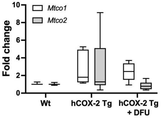 Gene expression of complex IV subunits is not modified in hCOX-2 Tg mice. Quantities of Mtco1 and Mtco2 mRNAs (the R0 values) were determined in hearts from Wt (n = 25), hCOX-2 Tg (n = 20), and hCOX-2 Tg mice treated with the COX-2 inhibitor DFU (hCOX-2 Tg+DFU, n = 13) using LinRegPCR data analysis. The amount of mRNA was then divided by the R0 value of Gapdh as normalization. Data are expressed as fold change relative to Wt mice.