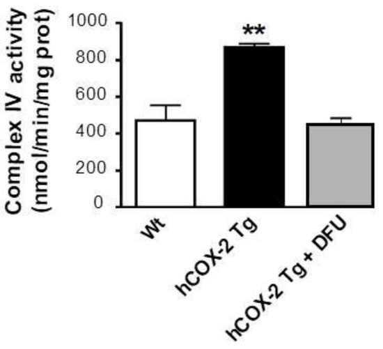 The maximal activity (Vmax) of respiratory chain complex IV was measured in the heart homogenate from Wt and hCOX-2 Tg mice. The results showed a significant increase in cytochrome c oxidase activity. In addition, treatment of hCOX-2-Tg mice with DFU (COX-2 specific inhibitor) reversed the effects on complex IV activity induced by COX-2-dependent prostaglandins. (Figure 9).