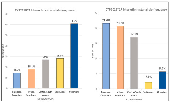 Galindo et al. [82] compiled 138 research studies to classify the prevalence of CYP2C19 alleles based on ethnic groups and geographical regions. Compared to the rest of the population, the CYP2C19*2 allele was more widespread in Native Oceanians (61.3%), and thereafter, in East and South Asians (30.3%). The CYP2C19*3 allele was likewise more frequent in Native Oceanians (14.42%) and East Asians (6.89%); in contrast, it was infrequent in the rest of the ethnic groups. Moreover, the star 17 allele was more prevalent in the Mediterranean and South Europeans (42%), and in the Middle Eastern region (24.87%). Frequencies are listed below from PharmGKB [82] in Figure 3.