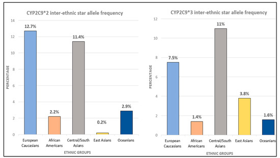 Moreover, advancements in pharmacogenomics research have progressively led to the corroboration of not only inter-individual but inter-ethnic differences in drug pharmacokinetics and pharmacodynamics. Considering the inter-ethnic differences in allele frequencies, the prevalence of certain genes in one ethnic group over the other can help prioritize those in need of testing or prescribing. This approach has been endorsed by the FDA [23] and clinical guidelines through the Clinical Pharmacogenetics Implementation Consortium (CPIC) [7] which recommend genetic screening before prescribing certain drugs, such as carbamazepine. Most studies focus on genetic variations of the Drug Metabolizing Enzymes (DMEs) CYP2C9, CYP2C19, CYP2D6, which are, primarily, responsible for phase I metabolism of around 40% of drugs in clinical use. Hence, several variant alleles have been uncovered; the most frequently reported are summarized in Table 1.