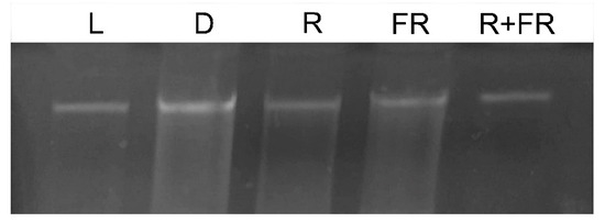Genomic DNA from maize leaves under different light conditions. L, plants illuminated with white light; D, plants kept in darkness; R, plants illuminated with red (660 nm) light; FR, plants illuminated with far-red (730 nm) light; R+FR, plants illuminated with red (660 nm) followed by far-red (730 nm) light.