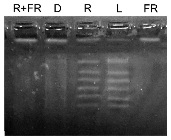 Genomic DNA from maize leaves was isolated by the phase distribution method based on phenol-chloroform extraction. Ammonium acetate (10 mM) was used as a specific precipitant [57]. The use of ammonium acetate to precipitate DNA during its isolation made it possible to increase its yield and purity [58]. Electrophoretic analysis of the resulting DNA preparation (Figure 1) indicated the absence of traces of impurities in the form of RNA. The MAL1 enzyme (SibEnzyme, Novosibirsk, Russia) was used to detect the methylated status of genomic DNA for adenine. The pattern of specific hydrolysis of genomic DNA from maize leaves under different light conditions was determined by the method of limited restriction analysis when processing 2 μg of DNA with 1 unit of the enzyme for 4 h at 37 °C [59].
