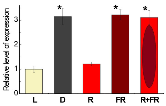 Relative level of Pif4 gene expression in maize leaves under different light conditions. Data are the means of three biological repeats ± SD. Asterisks indicate significant differences at p < 0.05. Abbreviations: L, plants illuminated with white light; D, plants kept in darkness; R, plants illuminated with red (660 nm) light; FR, plants illuminated with far-red (730 nm) light; R+FR, plants illuminated with red (660 nm) followed by far-red (730 nm) light.