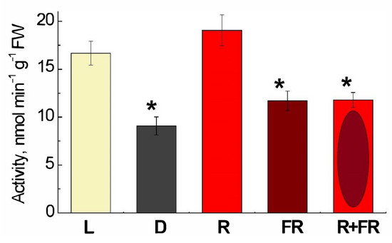 Changes in the activity of DNA adenine methylase in maize leaves under different lighting conditions. Data are the means of three biological repeats ± SD. Asterisks indicate significant differences at p < 0.05. Abbreviations: L, plants illuminated with white light; D, plants kept in darkness; R, plants illuminated with red (660 nm) light; FR, plants illuminated with far-red (730 nm) light; R+FR, plants illuminated with red (660 nm) followed by far-red (730 nm) light.