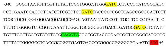 To study the influence of light regime of plants on the change in the adenylate methyl status of individual GATC sites in the genomic DNA, we analyzed the promoter of the gene of the mitochondrial citrate synthase (CS, EC 2.3.3.1) isoenzyme. Previously, the mechanism of light regulation of citrate synthase was established, which includes a change in the degree of promoter methylation for cytosine in CG dinucleotides, which leads to the inhibition of Csy1 gene expression [29]. Analysis of the nucleotide sequence of the promoter of this maize gene showed that in the region of the start codon there are three potential adenine methylation sites characteristic for Dam methylase (Figure 5).