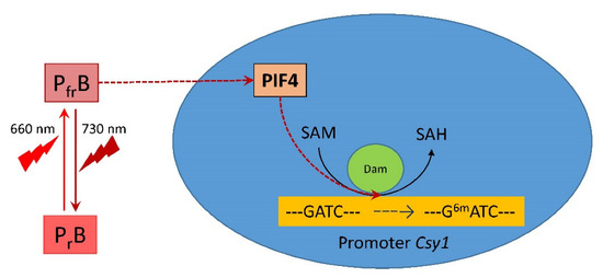 Our results are consistent with the involvement of phytochrome B in the transduction of the light signal as its effect is related to photoconversion upon sequential exposure of plants to red and far-red light. The observed change in the level of Pif4 gene transcripts indicates the operation of a negative regulatory mechanism characteristic for phytochrome B [47]. The obtained data demonstrate that the operation of Dam methylase is controlled by light via the phytochrome system, since its activity depends on the irradiation of plants with red and far-red light (Figure 4). Phytochrome B acts as a positive regulator of Dam methylase, and the decrease in PIF4 transcript level mediates this regulation mechanism. With the addition of a methyl group to the sixth position of the purine, the adenine ring can modify the interaction energy of bases and thus influence protein-DNA interactions [51]. It is possible that 6mA can regulate transcription by affecting transcription factors, RNA polymerases, histones, or other chromatin components. The specific correlation between 6mA and gene expression in different organisms is under regulatory control at different developmental stages [38,52]. The presence of 6mA in promoter regions causes the inhibition of gene expression, while its presence in the coding region correlates with the transcription activation, and thus adenine methylation in DNA acts as a regulatory mechanism in response to various stresses [53,54].