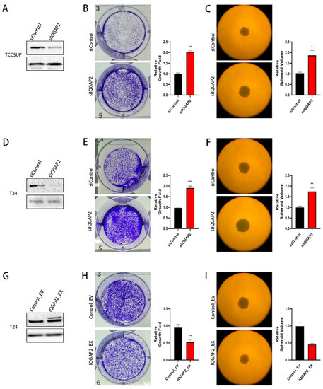 Reduced IQGAP2 promoted cell growth in bladder cancer cell lines. IQGAP2 knockdown in TCCSUP (A) and T24 (D) was confirmed by Western blot analysis. Knockdown of IQGAP2 in TCCSUP (B,C) and T24 (E,F) led to significant increase in proliferation in cell monolayer and spheroid growth. IQGAP2 overexpression in T24 (G) was confirmed by Western blot analysis. Overexpression of IQGAP2 in T24 (H,I) led to significant decrease in proliferation in cell monolayer and spheroid growth. One example in triplicate is shown; bar chart presents the means of replicates ± SEM from three different experiments; * p ≤ 0.05, ** p ≤ 0.01, and *** p ≤ 0.001; Student’s t-test (two-tailed, unpaired) was used for comparison of means.