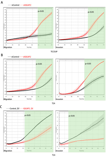 We next used an xCELLigence RTCA System to monitor the effect of IQGAP2 on the migration and invasion activities of bladder cancer cells in real time. The knockdown of IQGAP2 resulted in a higher rate of migration (p-value < 0.05 starting from 59 h) and invasion (p-value < 0.05 starting from 52 h) properties in T24 cells (Figure 4A). Similarly, promoted migration (p-value < 0.05 starting from 63 h) and invasion (p-value < 0.05 starting from 39 h) were observed in TCCSUP after the knockdown of IQGAP2 (Figure 4B). On the other hand, ectopic expression of IQGAP2 significantly inhibited the migration (p-value < 0.05 starting from 16 h) and invasion (p-value < 0.05 starting from 8 h) of T24 (Figure 4C).