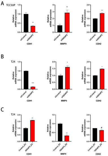The loss of E-cadherin and increase in N-cadherin, which is called the “cadherin switch”, has long been regarded as a major hallmark of epithelial–mesenchymal transition (EMT), the primary cause of metastasis [23]. MMPs are well-known to be associated with the development of invasive bladder cancer [24,25,26]. We detected a reduced transcription level of E-cadherin (CDH1) and increased transcription levels of MMP9 and N-cadherin (CDH2) after IQGAP2 depletion in both TCCSUP (Figure 5A) and T24 cells (Figure 5B). Moreover, the overexpression of IQGAP2 in T24 cells showed the opposite effect (Figure 5C).
