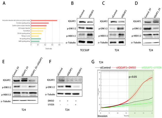 Following the above, we sought to determine how IQGAP2 modulated bladder cancer cell function. The c-BioPortal database was used to collect related genes to IQGAP2 regarding mRNA expression (Supplementary Table S3). The roles and pathways of these genes, as well as those of IQGAP2, were then predicted using KOBAS. The results showed an enrichment of pathways in cancer of, inter alia, Ras/MAPK and PI3K/AKT signaling pathways, and cytokine interactions were involved (Figure 6A). We first focused on examining the MAPK/ERK and PI3K/AKT signaling pathways in bladder cancer cells following knockdown or overexpression. After IQGAP2 knockdown, we observed an increase in phospho-MEK1/2 and phospho-ERK1/2 levels in T24 and TCCSUP (Figure 6B,C), whereas overexpression decreased phospho-MEK1/2 and phospho-ERK1/2 levels in T24 (Figure 6D). Additionally, silencing IQGAP2 in EX_IQGAP2 T24 cells restored the lower levels of phospho-MEK1/2 and phospho-ERK induced by IQGAP2 overexpression (Figure 6E). There were no significant findings for the AKT pathway (Supplementary Figure S2). As the ERK pathway has been implicated in EMT in different cancer types, we also evaluated this in the bladder cancer cell line T24. U0126, an ERK inhibitor, effectively suppressed the IQGAP2-depletion-induced increase in phospho-ERK (Figure 6F), while also abolishing invasiveness (p-value < 0.05 for the time frame of 22–42 h) (Figure 6G). These findings support the hypothesis that decreased IQGAP2 expression caused invasion with the involvement of the MEK/ERK pathway.