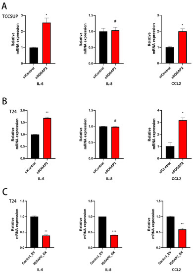 IQGAP2 expression reduced pro-inflammatory cytokine expressions in bladder cancer cells. qPCR showed elevated expressions of IL6 and CCL2 in TCCSUP (A) and T24 (B) with IQGAP2 knockdown (siIQGAP2) compared to control (siControl). qPCR showed reduced expressions of IL6, IL8, and CCL2 in T24 (C) with IQGAP2 overexpression (IQGAP2_EX) compared to control (Control_EV). Bar chart presents the means of replicates ± SEM from three different experiments; Student’s t-test (two-tailed, unpaired) was used for comparison of means; # indicates p > 0.05; * p ≤ 0.05, ** p ≤ 0.01, and *** p ≤ 0.001.